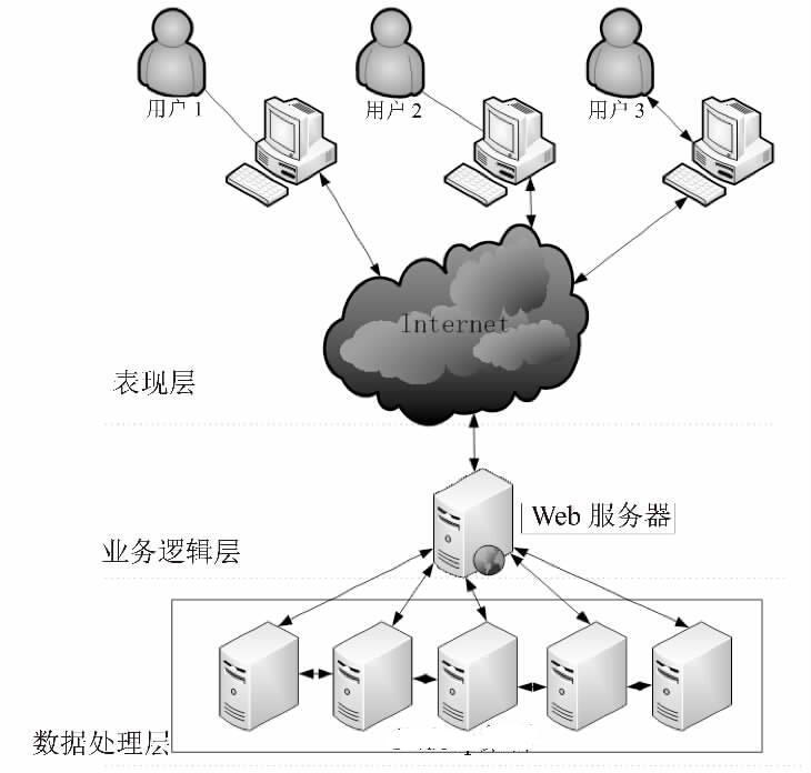 本文所介绍的系统的设计目标是实现海量、异构、分布的图片资源的快速检索和及时响应。系统采用分布式构架,由上而下分别由表现层、业务逻辑层以及数据及数据处理层组成,整体框架如下图所示。